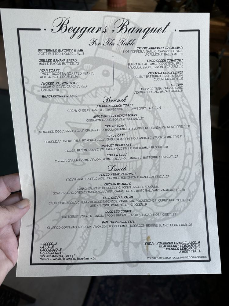 “ Me and the gals had a lady's brunch here a couple of months ago. I struggled to find the entrance door to the restaurant. I saw the sign above the door, but the door is basically blank or light designed. After going around to the side and back to the place that I started under the big sign, which logically would be the entrance, I opened it and voila! I was in. The hostess seemed a little perturbed or just plain unamused and I am sure others have done the same. In fact, one of the ladies in my group did the exact same thing as I did - started at the front door, noticed no vivid sign, walked around the side to see if there was a blatantly obvious entrance door with a sign, saw there was not and walked back to original door. ha! There could be a much bigger sign assuring customers of where to enter. Anyway, after the entrance fiasco, we all ordered much needed adult bevies to kick off the weekend. Martini espressos were the main drink of choice. Some also tried the kitten's mittens. All the drinks were tasty, not my fav martini espresso in the city, but a good one. The biscuits were ordered - those were tasty, the pear toast were good, the sriracha cauliflor was possibly the star dish - no pics tho, as was the ahi tuna - same, no pics. For entrees, I ordered the chicken Milanese which was good, but again did not blow me away. I would like to have tried the banana fosters French toast, but I couldn't do such a sweet dish. Maybe the next time. The bathroom decor was amazing. Everything was clean and I enjoyed the uniquness of the layout and decor. Overall, I enjoyed the food, the drinks, and the company. I liked some of the decor as well. The service was good I just think they need more of a sense of humor - I think we annoyed them with our entrance woes. But if I had to choose between serious service that tends to all our needs vs happy jokester service that does not tend to our needs, I prefer the serious service. I wonder how they got the name Beggars Banquet. I forgot to ask. hmm? Good times were had. Thanks for doing what yall do. ”